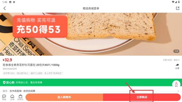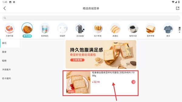 在商品列表里,找到你想查看的商品(比如轻食全麦奇亚籽吐司面包),点击它就能进入商品详情页面了。