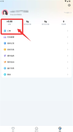 若要查看账户余额,可前往个人中心;需要洗衣服务时,则进入订单页面操作。
