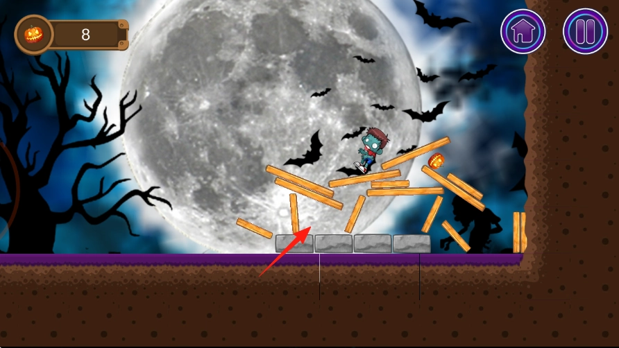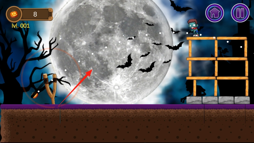 松开手指即可发射弹丸南瓜或道具,击中木架后,建筑会因物理效果坍塌,木块四散掉落,僵尸也会随着木架一同坠落。