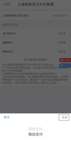 用户还能选择银联支付或微信支付,选好后点击完成按钮就行。