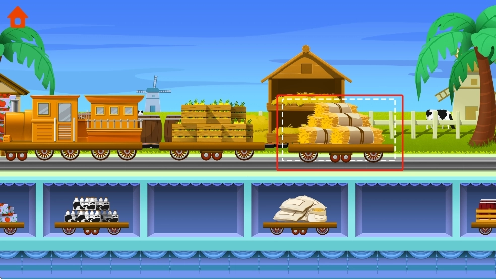 游戏开始时,我们先查看上层列车车厢里的货物,然后对照下层仓库的货架找到匹配的货物车,将其拖到列车对应的空位上,直至把车厢装满。