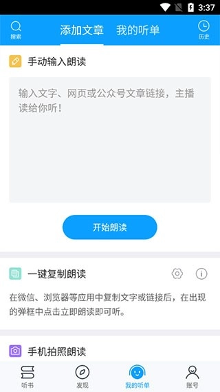 切换到“添加文章”页面后,就能添加复制的文字,还可以开启人声朗读功能。