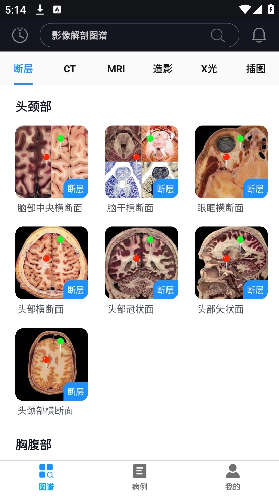 图谱部分包含断层解剖、CT解剖、MRI(磁共振成像)、医学插图以及造影等多个类别,完整覆盖了人体的各个部位与系统。
