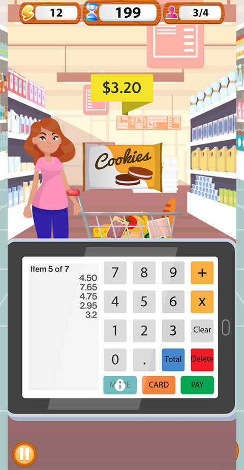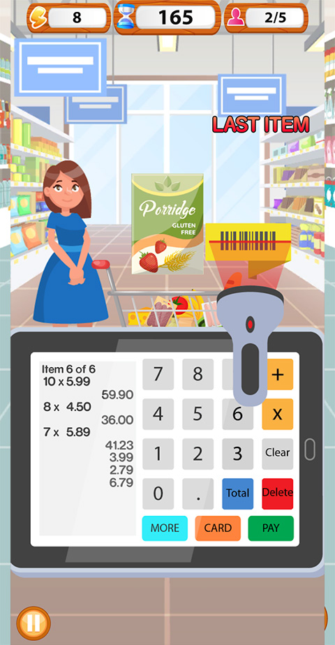 游戏超级真实的模拟了超市收银的工作,你需要使用扫码器、键盘等计算物品的价格,最后不要忘记有些物品是打过折的哦!游戏随着关卡越多,还会解锁超市更多产品哦~