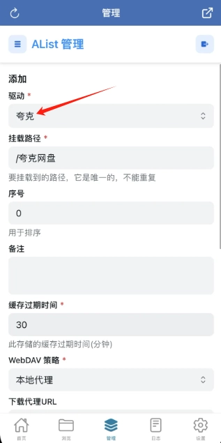 1. 管理后台选择"添加存储",驱动类型选"夸克"