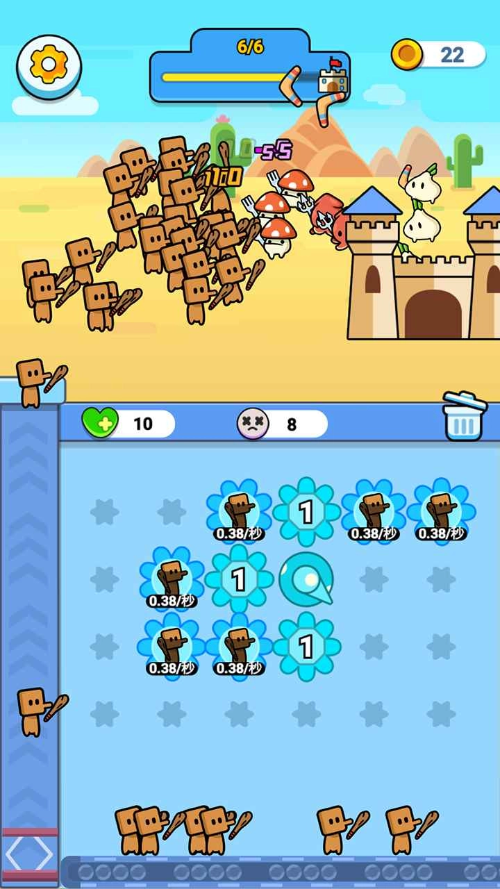 合成升级齿轮可以提升召唤效率,还能解锁新类型的小兵;通过战斗,小兵能积累经验、升级技能并装备道具。