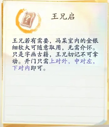 3. 在梅坞的房子里,具体位置可参照图中的小地图。进入梅坞门口后,右手边便是。同样,在桌子上能找到线索字条。线索所表达的是,要让三个碗口都朝着灯的方向,简单来说,就是全部碗口都朝“右”,如此操作解锁机关后,便会出现一个密室。