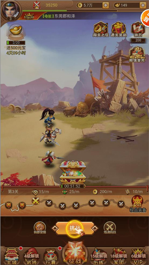 2、玩家成功完成挑战通关后,能够获取经验与金币,这些可用于武将升级。在游戏过程中所获得的装备,武将可以穿戴,进而提升自身属性。