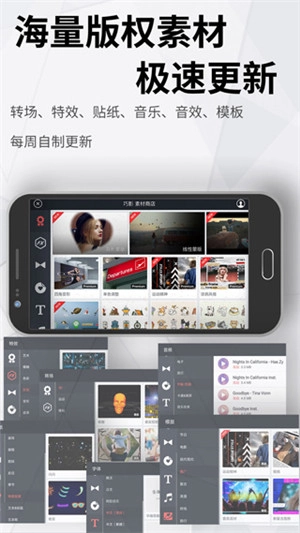 特效、贴纸、音效、转场等素材每月都会更新,此外还有iKON、BIGBANG、SECHSKIES、会说话的汤姆猫家族、B.Duck小黄鸭、蛋黄哥的授权视频素材。
