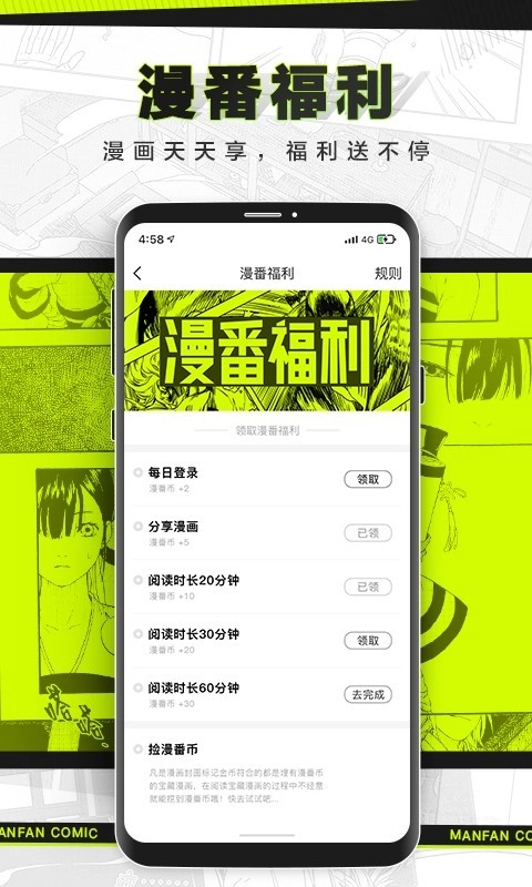 之后我们只需要在这个界面里,完成对应的任务,完成后点击【领取】按钮,就能得到漫番币了。