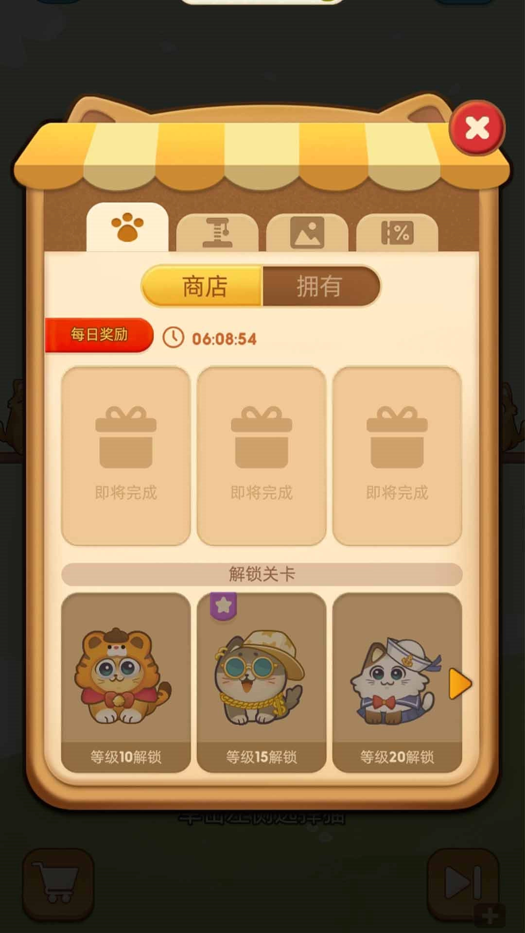 消除三个或三个以上相同类型的方块,就能得到高分,还能解锁小猫角色。