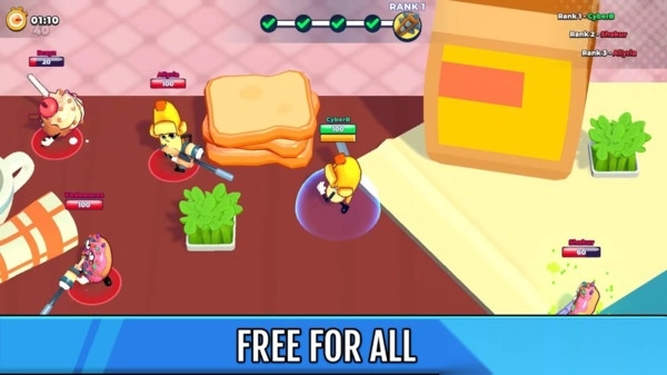 2、沉浸式3D场景:构建餐桌、厨房等生活化场景,细节丰富(面包、蔬菜道具、色彩明快的桌面纹理),使玩家仿佛置身微观食物世界,增强场景代入感,让对战体验更具沉浸感。