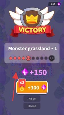 1、战斗胜利后,在结算页面领取“Monstergrassland·1”和钻石奖励,然后点击“Next”以解锁新的关卡。