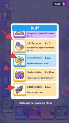 2、战斗前,选择兵种(Spear、Archer等)部署,搭配Buff(如“InkTycoon”提升资源),增强战力。