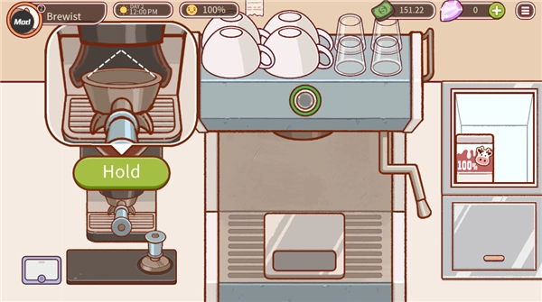 点击中间机器上的绿色开关,然后开始装入咖啡。请注意下方有一个进度条,当进度条快到绿色范围前,及时关闭开关就可以了。