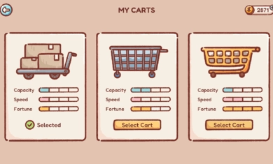 通过完成任务、赚取金币,解锁新的零食品类,还能升级购物车与自动售货机。