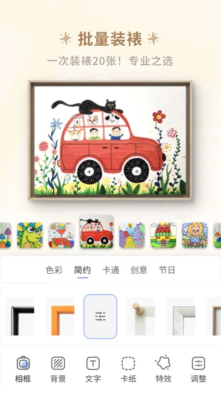 超过200种风格各异的相框模板,涵盖卡通、自然、节日、抽象等主题,支持实时预览与调整。用户可根据作品风格选择木质、塑料、金属等材质效果,并自定义相框颜色、纹理与装饰元素。