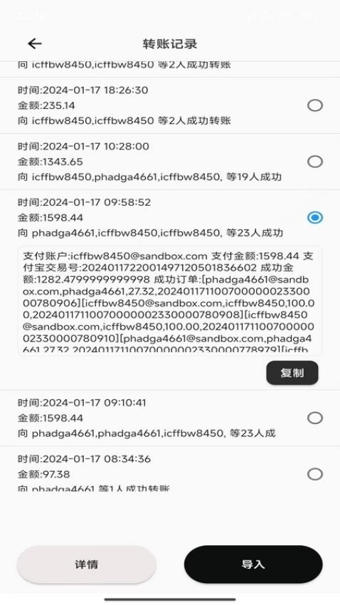一键批量转账是一款专注于线上转账的应用软件,支持用户通过支付宝完成转账操作,方便用户给员工在线发放工资,借助便捷的线上批量转账功能,就能快速实现工资的发放。用户可以将员工的支付宝收款信息批量导入,进而发起转账流程。平台会实时展示转账结果,助力用户顺利完成转账,轻松实现多人转账操作,还能对员工工资进行日结处理。另外,该软件还支持用户在线查询转账记录,所有记录都会被系统保存,用户可随时复制使用。