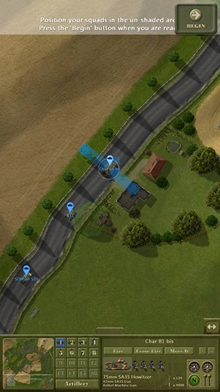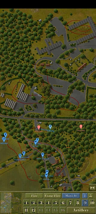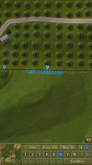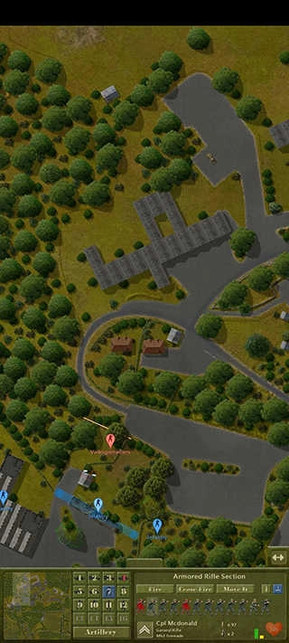 从图中可以看出,当前局势十分危急。我方剩余的回撤部队已被敌军发现,不过因身处复杂的丛林环境,并未受到交叉火力的压制。我决定命令他们发起强行进攻,同时调派M5A1坦克提供支援。位于地图最左侧的机械步兵则执行迂回穿插任务,由于该机械步兵团的位置被遮蔽物环绕,无需担忧会遭受火力打击。