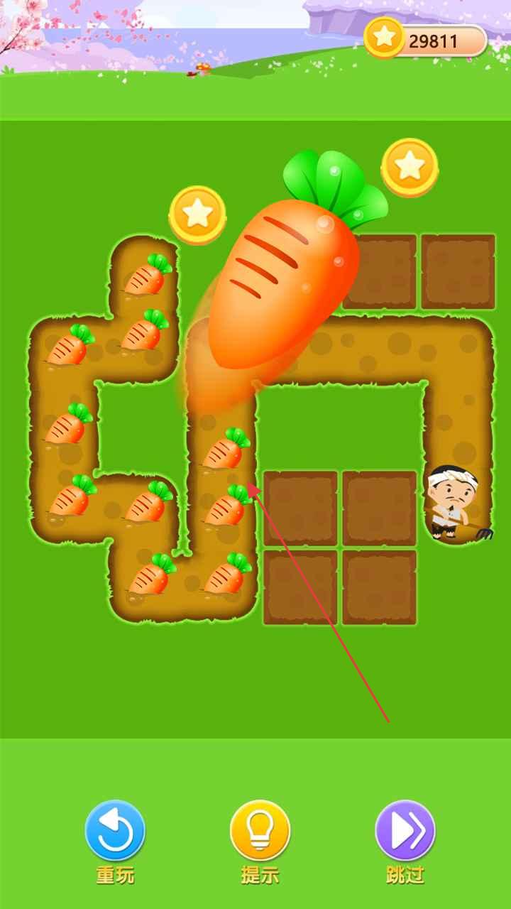 1、在萝卜关卡,操控农民,沿箭头路径,规划路线,收集萝卜,避开障碍,完成关卡。