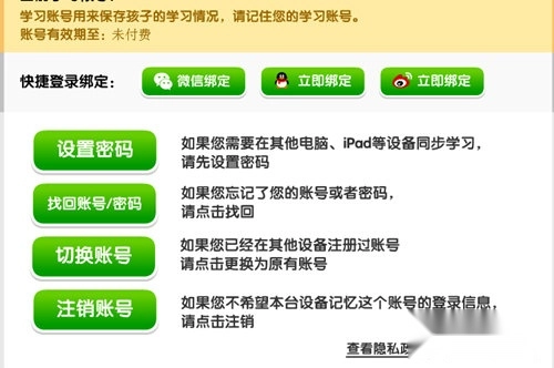 若想清空学习进度,家长可使用其他账号完成悟空识字的账号绑定。在系统设置里,支持通过微信、QQ、微博三种途径快速登录,每个新账号都对应着全新的学习进度。