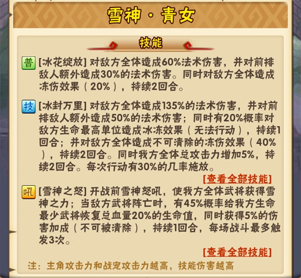 雪神·青女的战吼技能和吉神·火凤、战神·蚩尤类似,这里不展开解析。核心还是看技能表现:她的普攻和吉神·火凤的普攻基本一致,只是伤害高出10%,本质上换汤不换药。 雪神·青女的技能效果很全面:全体伤害基础上,前排目标额外受击;给主将追加一次攻击;还能提升全体攻击力——不管是打叛军还是实战,全体输出拉满的体验都很舒服。 她最突出的特色是概率冰冻效果:0星就自带这一机制,2星时冰冻效果变为不可清除,3星在冰冻状态下附加禁疗(无法恢复生命),且冰冻持续2回合;5星后冰冻几率直接拉满至100%。能明显看出,每提升一个星级都是一次质变,让宠物的技能效果更上一层楼。 有了雪神·青女后,蜀王的罩子能轻松,华佗也没法清除她的特色效果了,完全不用再担心这些问题。