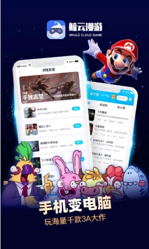 鲸云漫游是一款融合云游戏平台与云电脑服务的应用程序,致力于为玩家打造流畅稳定的云游戏体验。它打破了硬件设备和操作系统的束缚,让玩家即便没有高性能硬件,也能轻松畅玩大型3A游戏——哪怕手机配置不高,也能体验到PC端的高质量游戏!在鲸云漫游,玩家无需下载或安装游戏,也不必操心游戏更新,一键启动就能立即享受游戏乐趣。