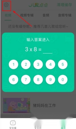 首先,家长们需点击儿歌点点右下角进入【缓存】页面,接着点击左上方的【齿轮】设置图标,此时系统会弹出验证菜单,题目为小学数学题,输入正确答案后就能进入设置页面。