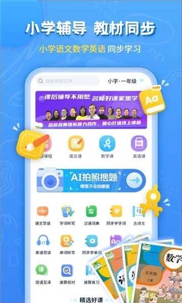 一年365天持续更新小学语文、数学、英语三科的学习内容。平台配备拍照搜题、英语口语测评与练习、语文及英语课文听读、同步识字、字词与单词听写、同步学单词、速算口算、竖式练习、速算校对、单位换算、各科同步课后练习、作文库、古诗文库、汉英辞典、双语互译等20多款智能教辅专项工具,全面解决小学课内学习需求。