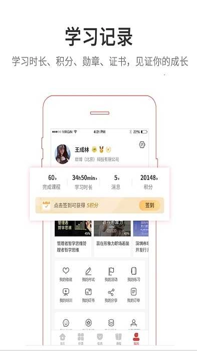 进入主页后,可查看学习记录、排行榜、考试任务以及最新课程。