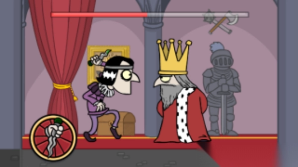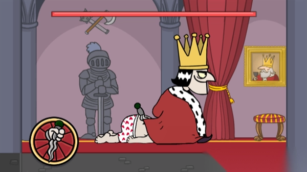 3、角色和场景展示的是“刺杀国王”相关情节中,国王被攻击后的状态,这是一个具有特色趣味搞怪风格的关卡场景。