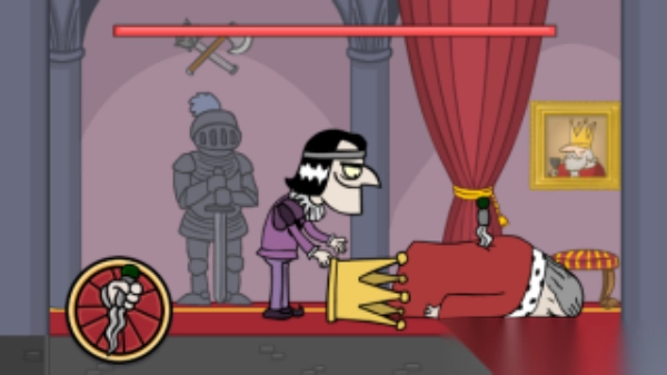 1、角色(持武器的臣民、戴皇冠的国王)、场景(宫殿内,有窗帘、铠甲、武器等元素),属于经典的“刺杀国王”前的互动场景,玩家操控臣民角色尝试通过策略行动取代国王。