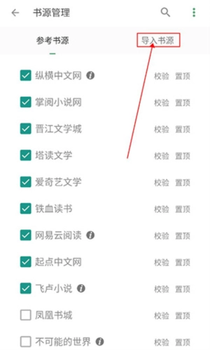 进入书源页面后,就能看到软件里有很多书源可供选择,不过我们的目标是导入书源,所以直接点击右侧的“导入书源”按钮就可以了。