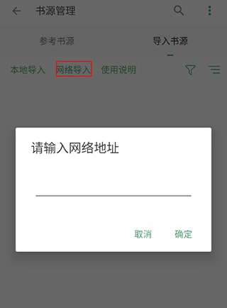 网络导入的话,需要用户输入书源网站的地址,要注意输入准确,不然可能会导入失败。