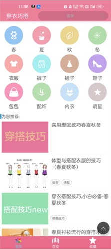 首先安装并打开穿衣搭配指导软件,其首页呈现着各类穿搭资讯,涵盖春夏秋冬四个季节以及多种不同种类。