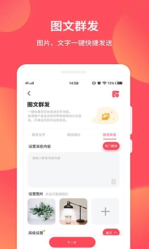 一键自动群发图文消息、亲密群发、群发公众号、群发小程序、群发微信群,专业开发工程师团队精心优化算法,只为每一次群发都更加稳定快速。