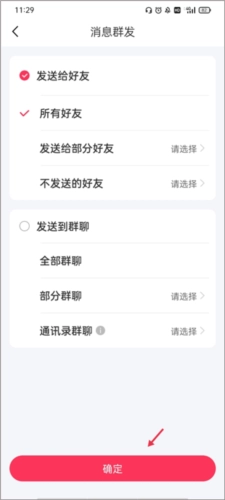 第一个参数用于设定群发的范围,例如是某组群聊,还是部分好友。设置好该条件后,点击确定按钮即可。