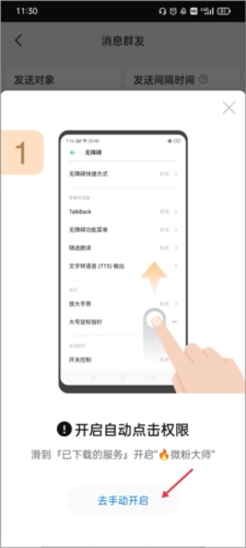 这时页面弹出了一个提示,说明要进行消息群发操作,必须先开启自动点击权限。