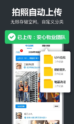 拍照可自动同步到团队,支持自定义分类存储,提供免费无限存储服务,能随时查看并批量导出,既不占用手机空间,又能节省手机内存。