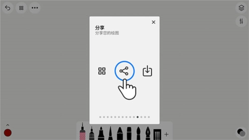 当完成一个作品后,若想分享出去,只需点击左上角的三个点,此时会出现图片里的图标,点击该图标后会弹出选项,我们可以从中选择PNG、JPG和Sketches绘图这几种格式进行导出。