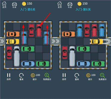 2、启动挪车大师,发现多辆车阻碍了黄车通行,先将中间的两辆红车向上移动,接着将两辆蓝车也向上调整位置,黄车即可顺利驶出。