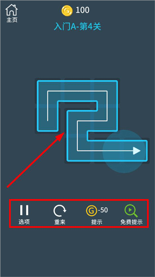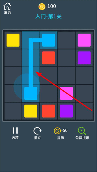 4、开启一路到底模式,将方块连接成一条线,若遇到困难可点击游戏界面下方的提示按钮获取帮助。