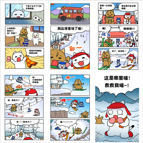 猫老大初次滑雪,速度失控,径直冲下了悬崖!
