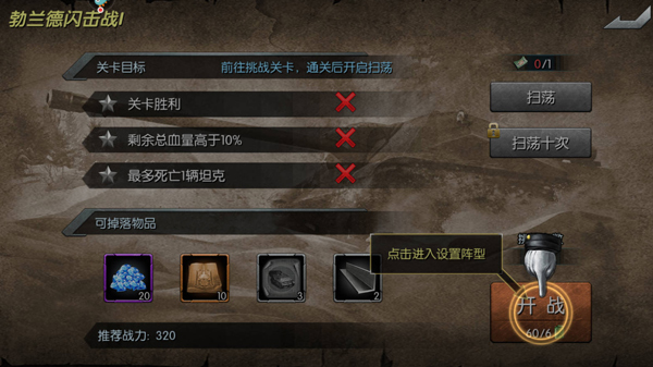 3、根据新手引导进入战斗指引,选择第一个关卡,选择好坦克,最后进入战斗