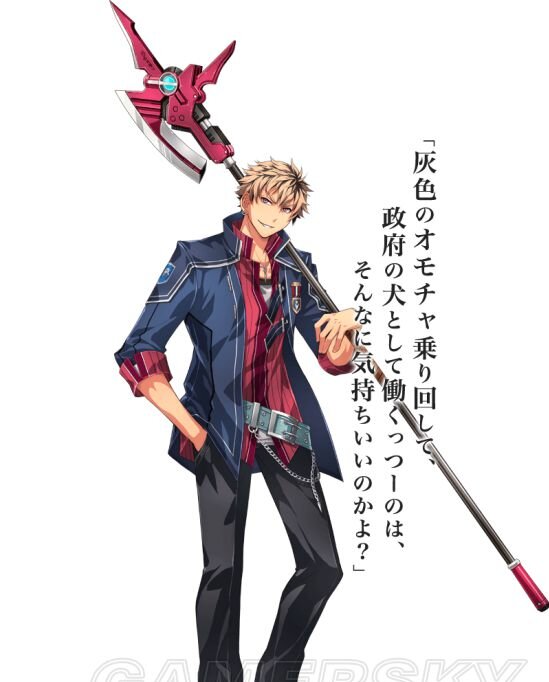 人物介绍:在帝国西部贫民街长大勇猛的不良青年,表面看上去很开朗,却似乎有着阴暗的一面,就读于《VIII班·战术班》。内战中,他曾结成一支小队击退了野盗团体,因此被正规军和游击士协会看中,可是他却拒绝了邀请。在知道他从小就有所失去,了解“他的过去”的某人推荐下进入第二分校学习。虽然体型较大却有着像豹子般柔韧的身躯,他会用秘技解决掉比他厉害的对手,对黎恩教官有着挑衅意味的言行。