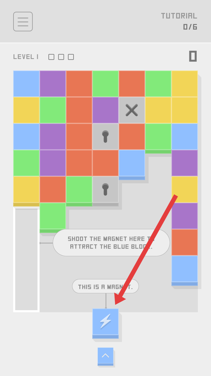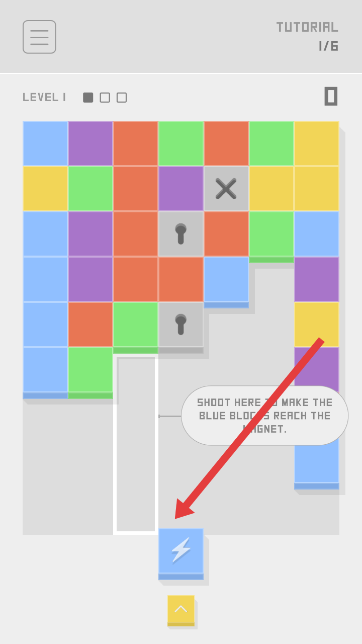 1点击下面标有闪电的蓝色【MAGNET】方块,射击指定区域,使用磁力来吸引蓝色色块进行移动。