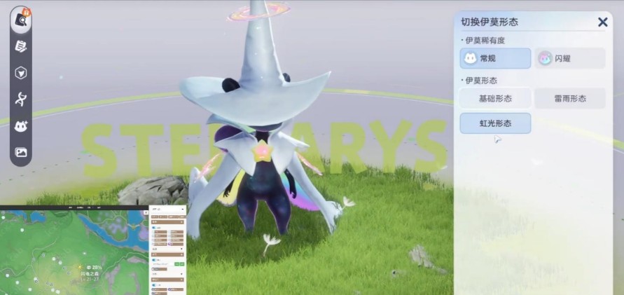 当前时间没有的话,大家也不用着急,这些宠物会在这里进行一个定时的刷新,而且大概率的刷新地点是遗迹周围的树木,如果是在树荫底下,大家找到它的话就可以进行捕捉,当然这里大家想要的是虹光形态的星魔师,那么就要注意这一片区域当中目前显示的天气,如果不是虹光天气当中的话,抓捕到的星魔师基本都是普通形态的,只有在虹光天气当中出没的星魔师才是虹光星魔师,而此类星魔师在外观上面跟基础的星魔师都会有很大的区别,而且虹光星魔师会有更多亮闪闪的特效。