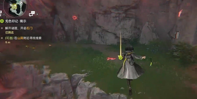 寻找印记:在障碍右侧墙壁找到小石头,点击调查发现无色印记