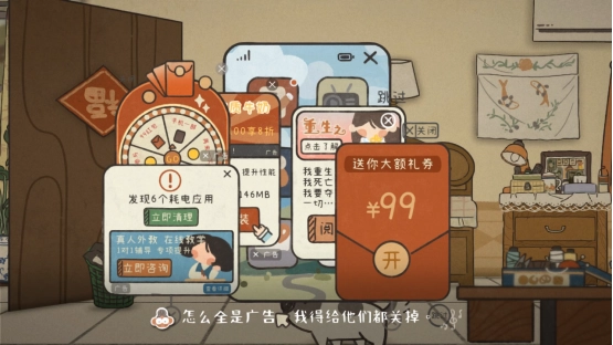 他们大部分不擅长使用智能设备,很难在网上为自己发声,甚至连使用智能设备都是一大麻烦,所以在游戏中设计了几段关于“数字鸿沟”的剧情。比如不断弹出广告的病毒弹窗、老年人手机误触静音键等等。