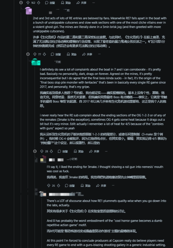 而玩家在讨论《生化危机7》的缺点中,遇难船、矿场这些后期章节成为了reddit玩家主要吐槽的点。一名玩家表示:“一个很棒的起始区域,还有后期越来越没意思的区域,说实话,这可以说是生化危机的缩影。”